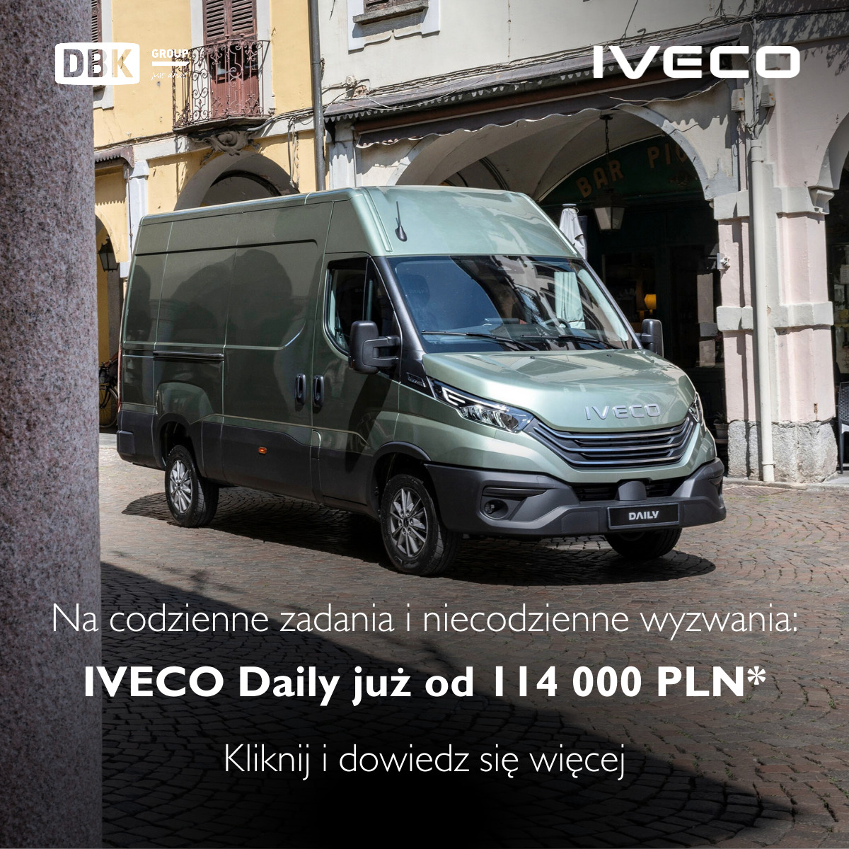 *Cena 114 000 PLN jest rekomendowaną ceną maksymalną netto (nie zawiera VAT) i ma charakter niewiążącej rekomendacji importera Iveco Poland sp. z o.o. Promocja dotyczy modelu IVECO Daily furgon o kubaturze 12m3, w wersji podstawowej. Cena promocyjna dotyczy wyłącznie pojazdu we wskazanej konfiguracji bez wyposażenia dodatkowego. Liczba pojazdów objętych promocją jest ograniczona. Promocja jest skierowana do przedsiębiorców i trwa do 30.06.2026 r. lub do wyczerpania zapasów. Niniejszy materiał nie stanowi oferty w rozumieniu art. 66 Kodeksu Cywilnego, a jedynie zaproszenie do zawarcia umowy).