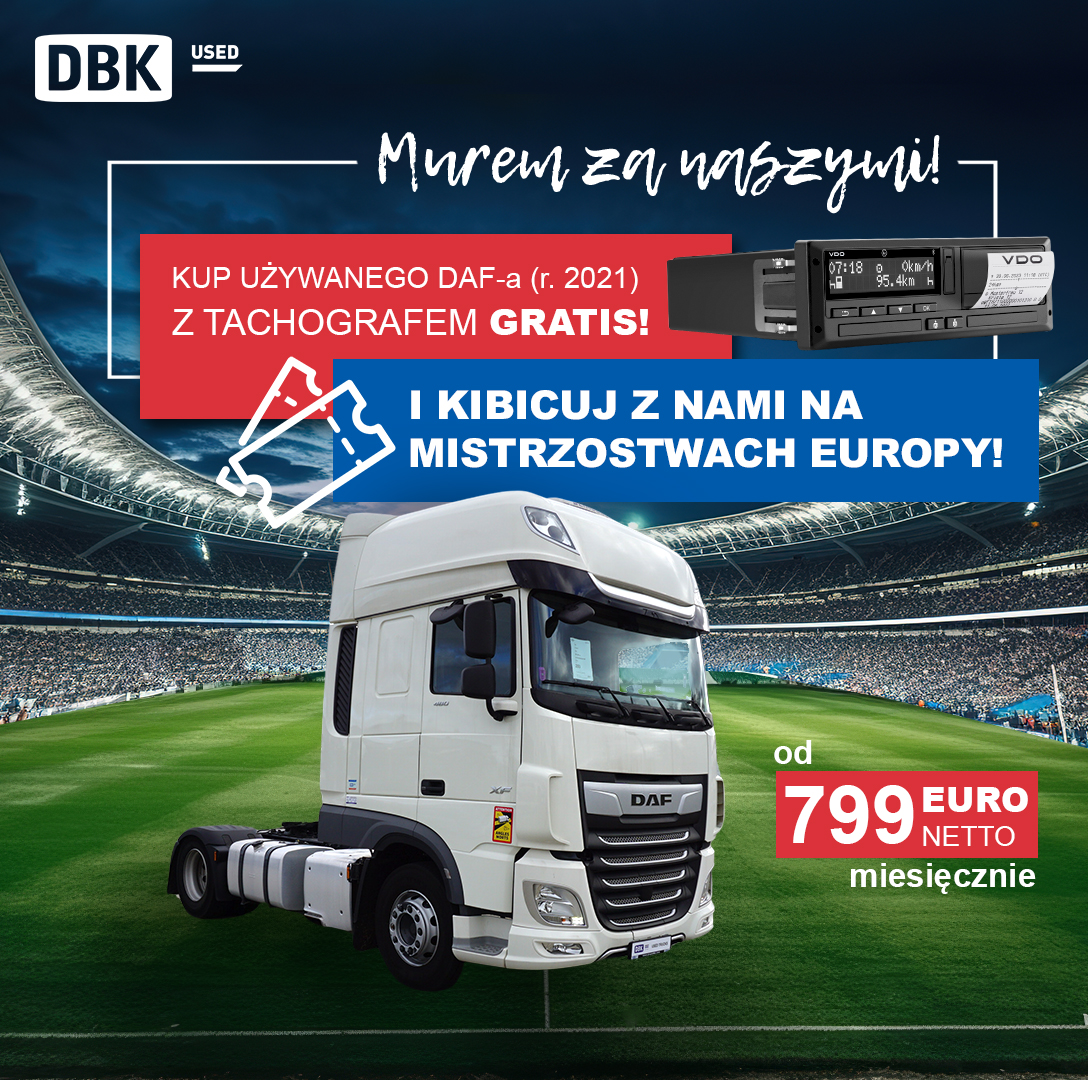 Kup używany ciągnik siodłowy DAF z rocznika 2021 w korzystnej ofercie od 799 euro netto miesięcznie i z inteligentnym tachografem w cenie pojazdu wraz z profesjonalnym montażem w autoryzowanych serwisie Grupy DBK (bez dodatkowych kosztów)* i odbierz bilet na mecz Reprezentacji Polski podczas Mistrzostw Europy!