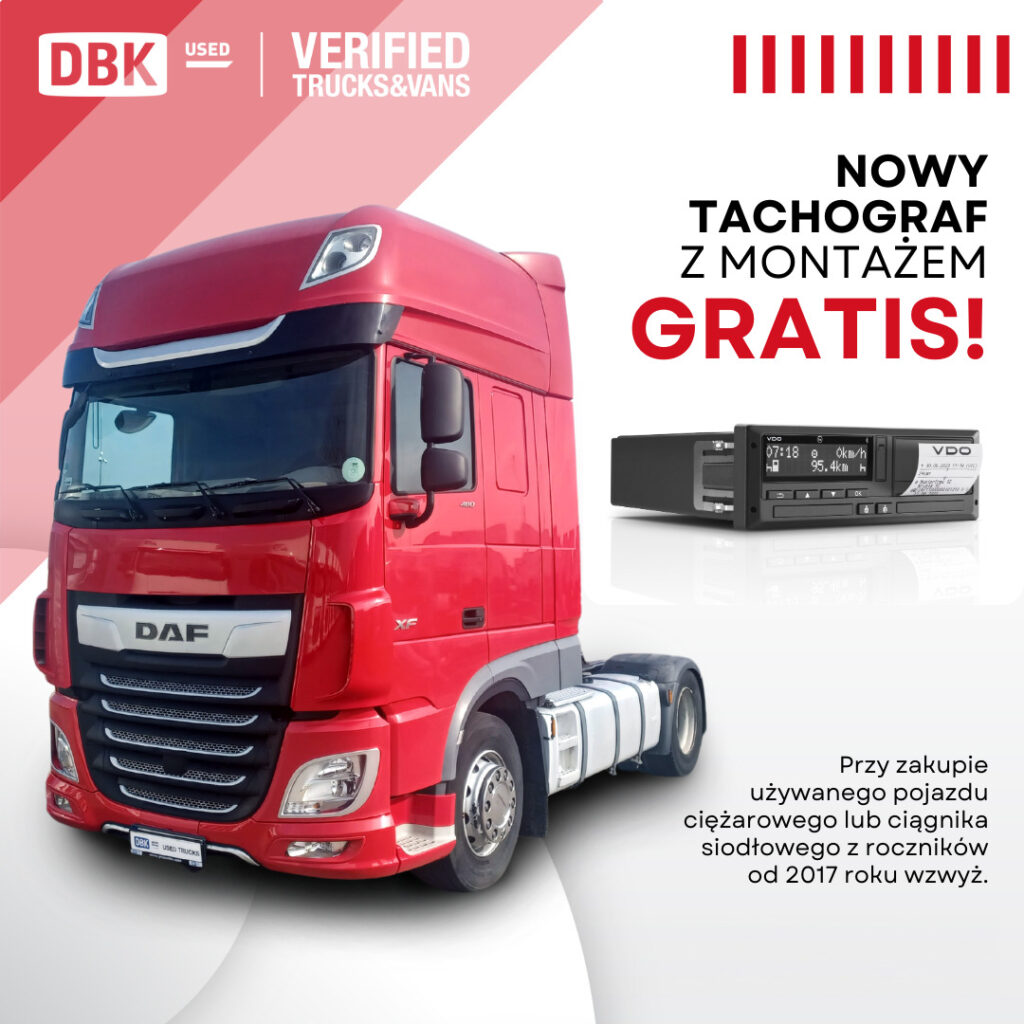 Przy zakupie każdego używanego pojazdu ciężarowego lub ciągnika siodłowego z naszej oferty z roczników od 2017 roku wzwyż, otrzymasz nowy tachograf wraz z profesjonalnym montażem w autoryzowanym serwisie Grupy DBK bez dodatkowych kosztów!