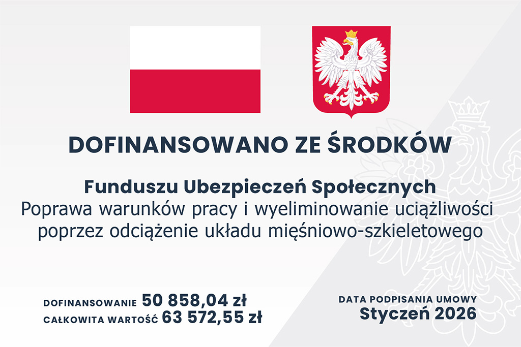 Informujemy, że nasz projekt „Poprawa warunków pracy i wyeliminowanie uciążliwości poprzez odciążenie układu mięśniowo-szkieletowego” otrzymał dofinansowanie w wysokości 50 858,04 PLN z Funduszu Ubezpieczeń Społecznych. Całkowita wartość projektu wynosi 63 572,55 PLN.