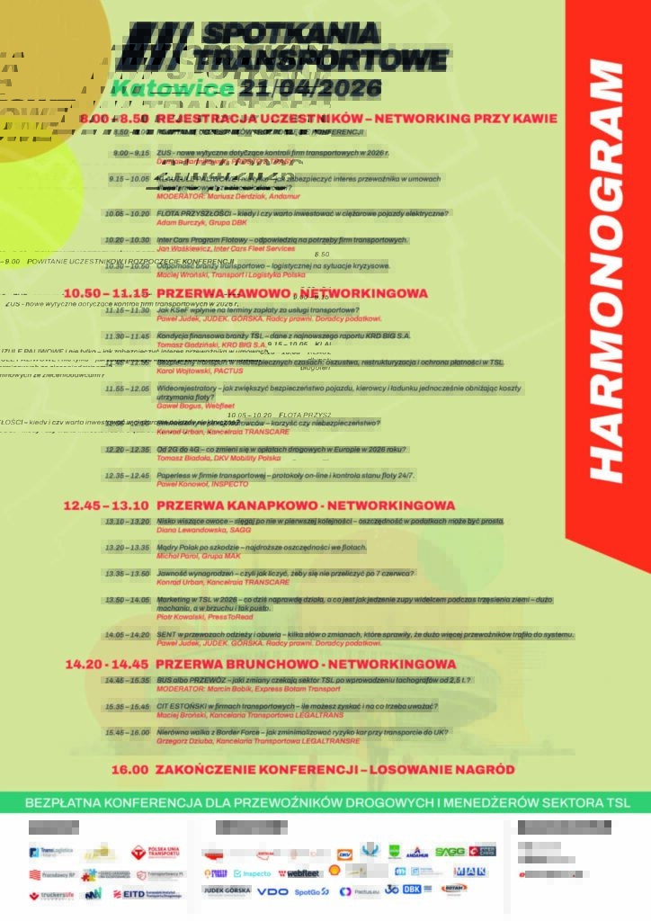 Program katowickiej edycji został zbudowany wokół tematów szczególnie istotnych dla firm transportowych w 2026 roku. W agendzie znalazły się między innymi zagadnienia dotyczące nowych wytycznych ZUS dla firm transportowych, klauzul paliwowych w umowach długoterminowych, wpływu KSeF na terminy zapłaty za usługi transportowe, kondycji finansowej branży TSL, ochrony płatności, wideorejestratorów, opłat drogowych w Europie, cyfryzacji procesów, oszczędności podatkowych, jawności wynagrodzeń, zmian w systemie SENT, tachografów dla pojazdów od 2,5 tony oraz ryzyk w transporcie do Wielkiej Brytanii.