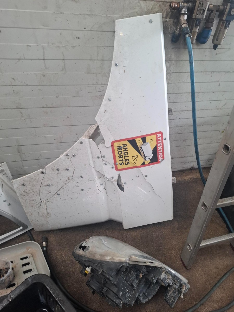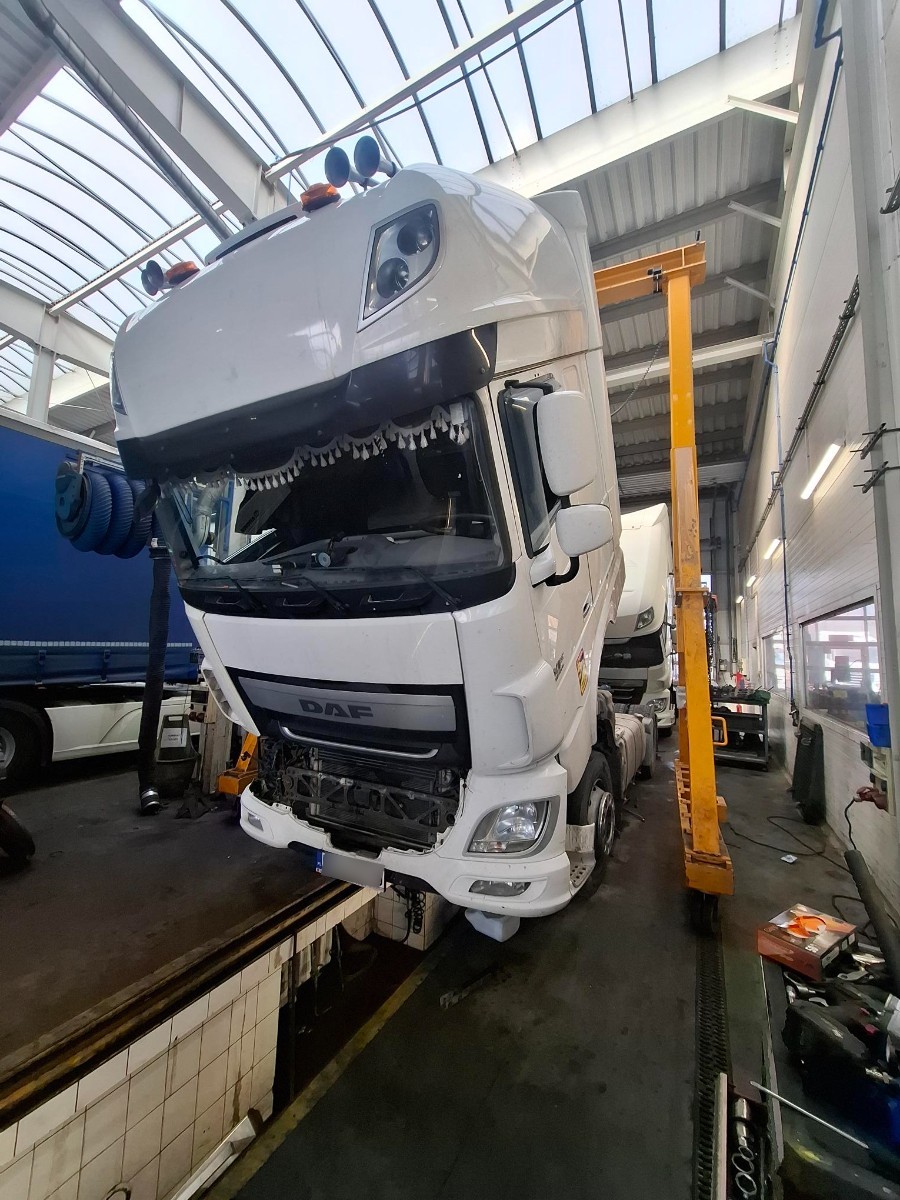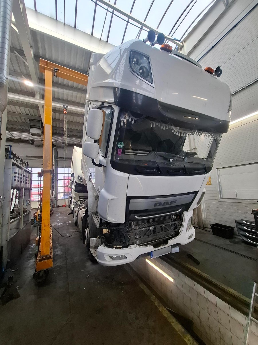 Do serwisu Grupy DBK w Białymstoku trafił pojazd DAF XF E6, który uległ uszkodzeniu w wyniku kolizji. Incydent miał miejsce podczas wyjazdu betonomieszarki z placu budowy, która zahaczyła tyłem o prawidłowo zaparkowany pojazd DAF.