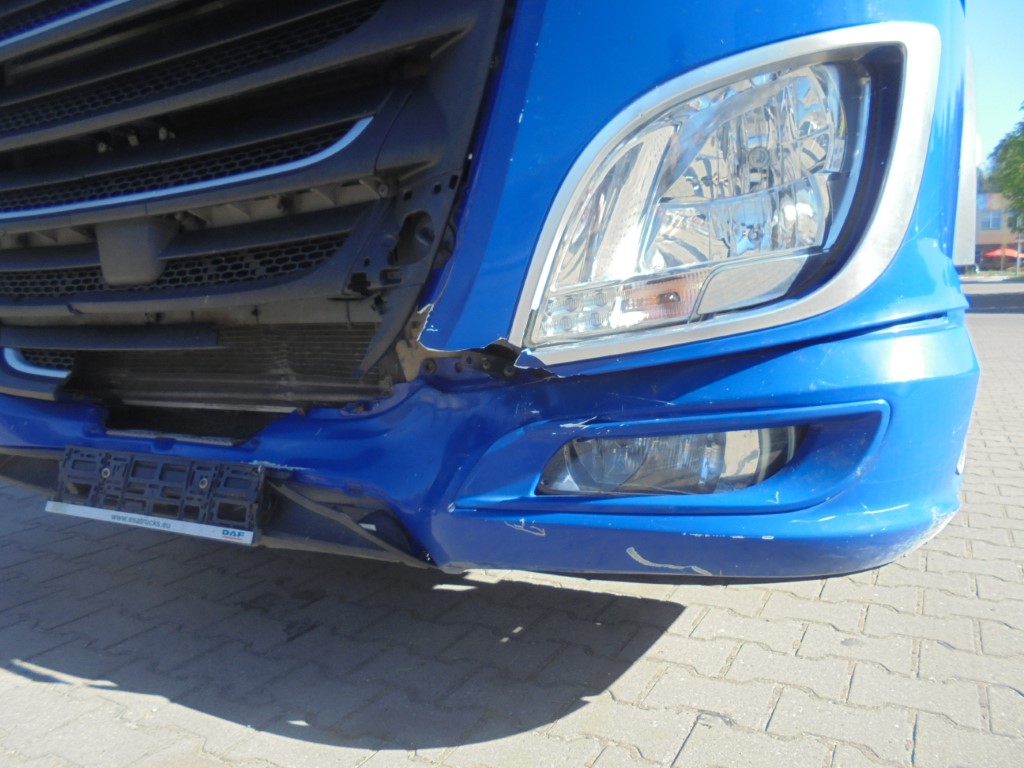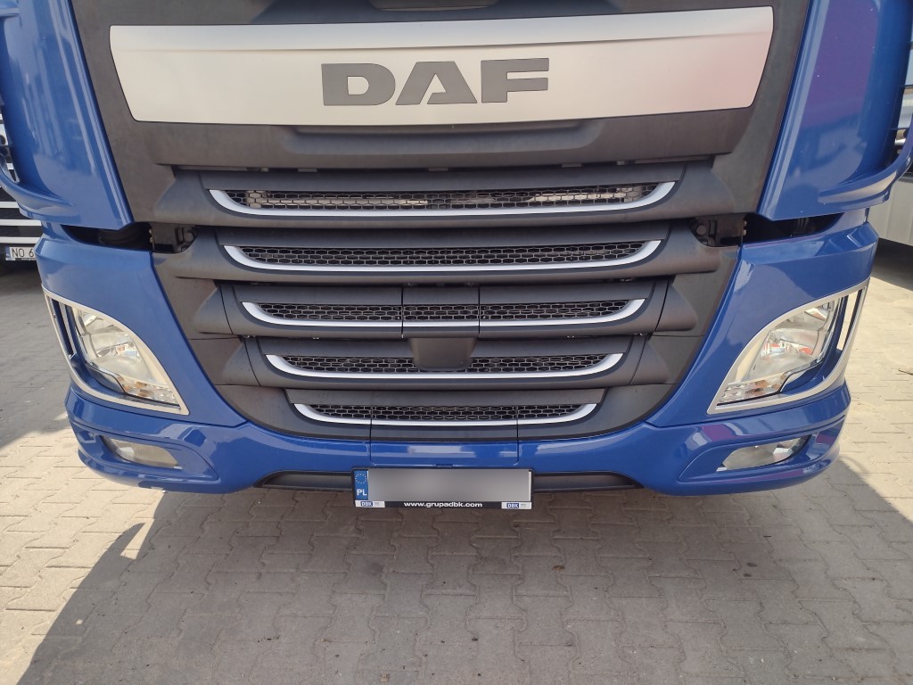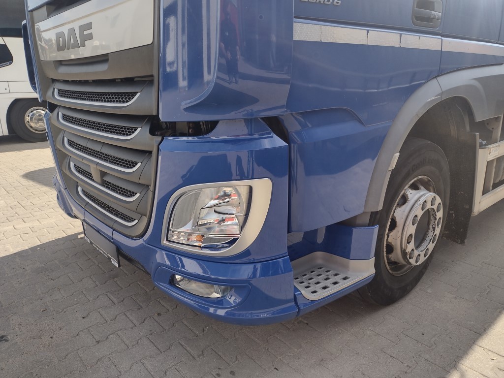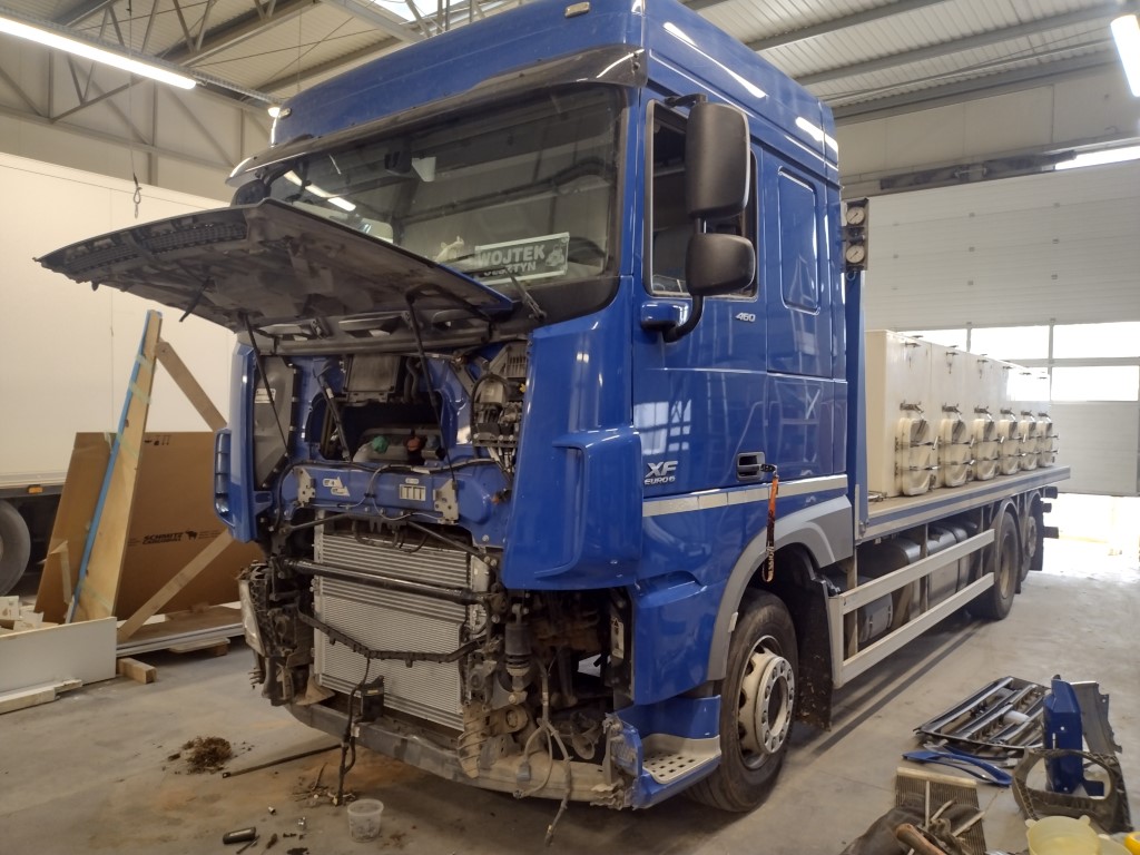 Do naszego serwisu w Olsztynie trafił pojazd ciężarowy marki DAF XF, który ucierpiał w wyniku najechania na tył innego pojazdu. Uszkodzenia skoncentrowały się w przedniej części, obejmując m.in. zderzak, osłonę chłodnicy oraz powiązane elementy mechaniczne i konstrukcyjne.