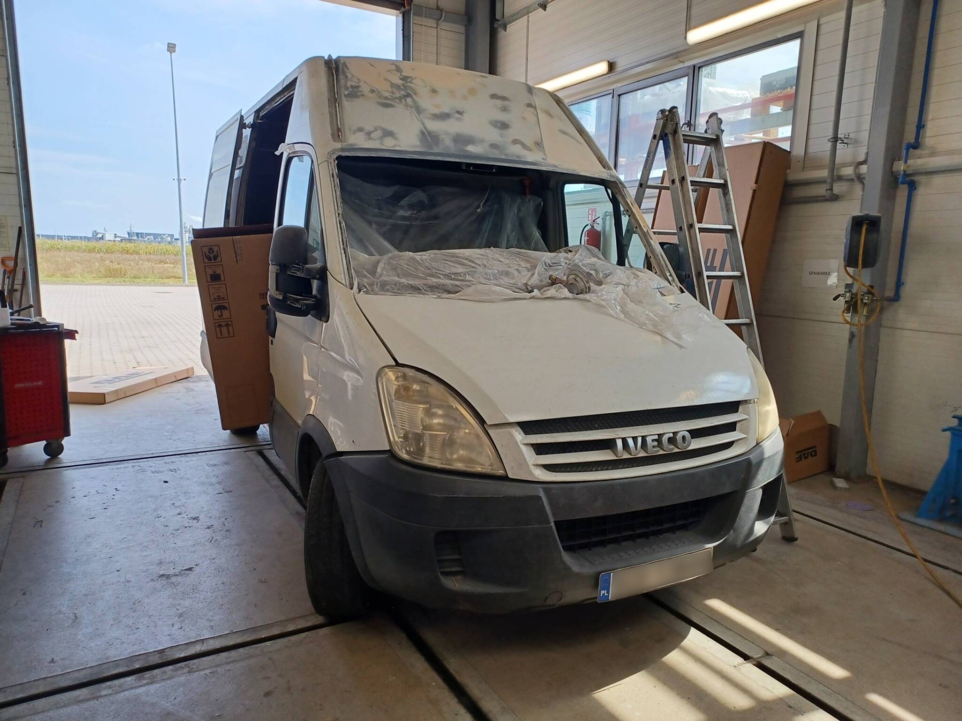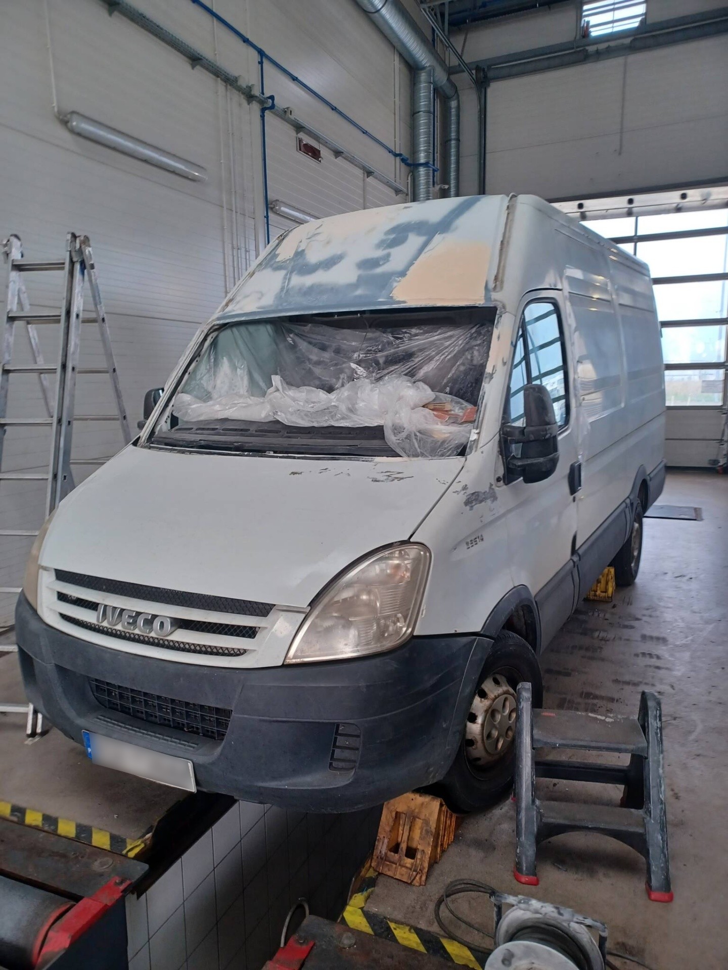 Do naszego serwisu w Suwałkach trafił pojazd Iveco Daily, którego dach, szyba czołowa i maska zostały uszkodzone przez wystające elementy z naczepy innego pojazdu podczas manewru cofania. Ze względu na charakter uszkodzeń, transport do warsztatu odbył się przy użyciu lawety, a jego koszt został w pełni pokryty z polisy OC sprawcy.