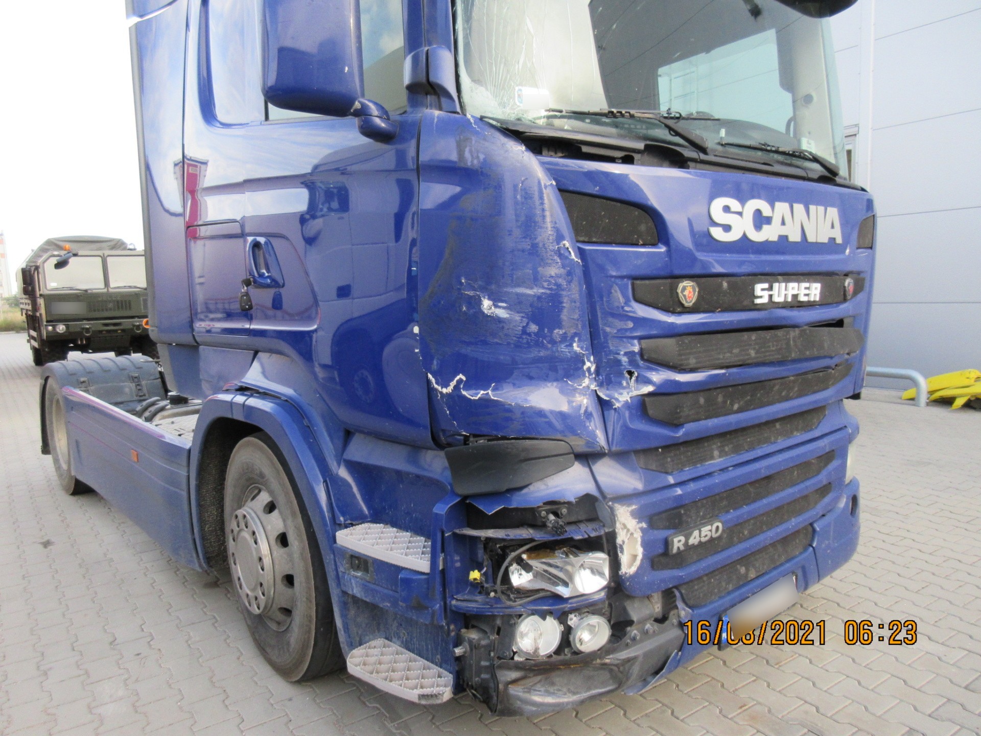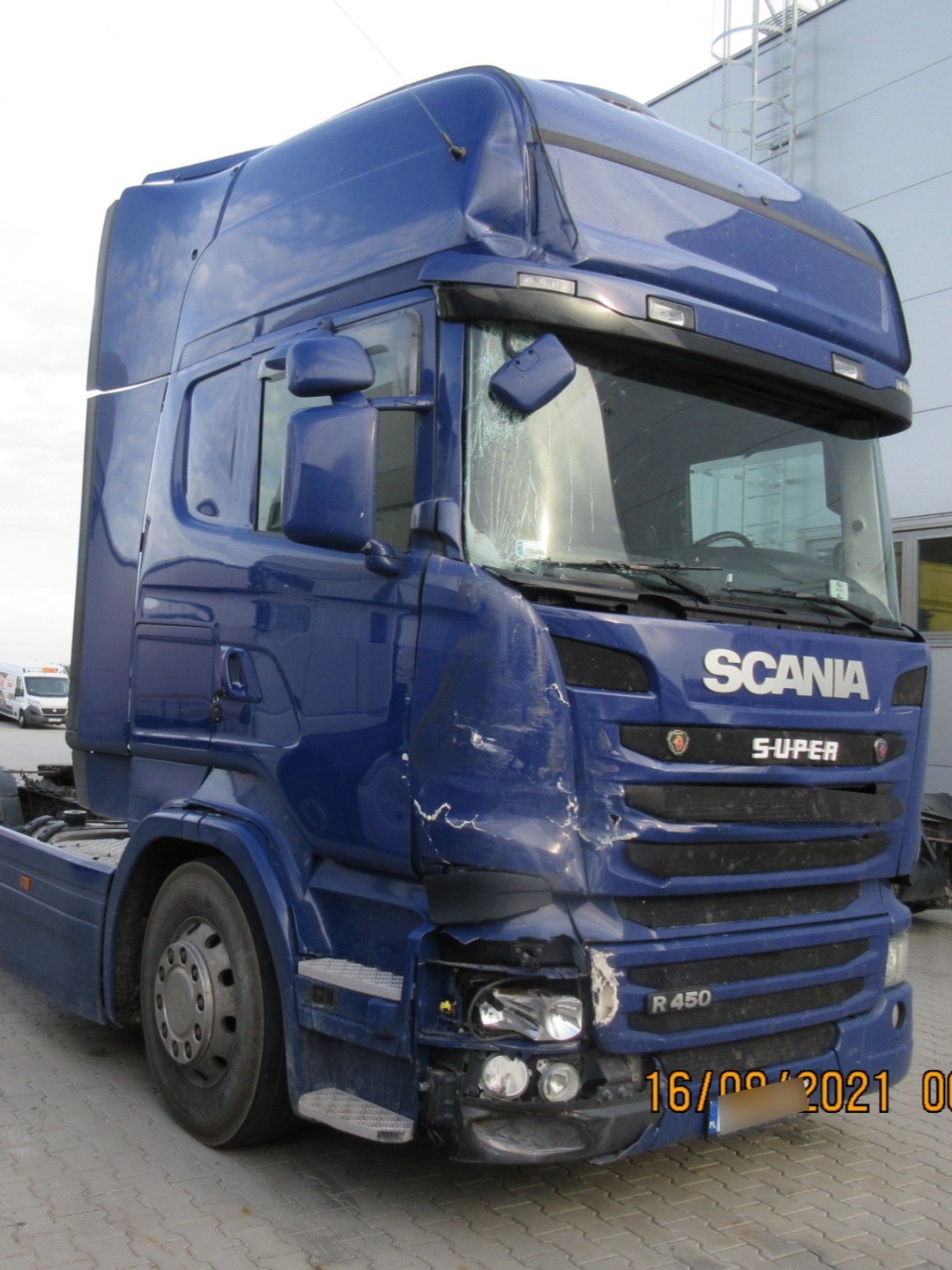 Do serwisu Grupy DBK w Suwałkach trafiła Scania R 450 z poważnymi uszkodzeniami prawej strony kabiny, powstałymi w wyniku kolizji drogowej. Skala zniszczeń obejmowała kluczowe elementy – od szyby czołowej i maski silnika, po drzwi, reflektor i elementy konstrukcyjne kabiny.
