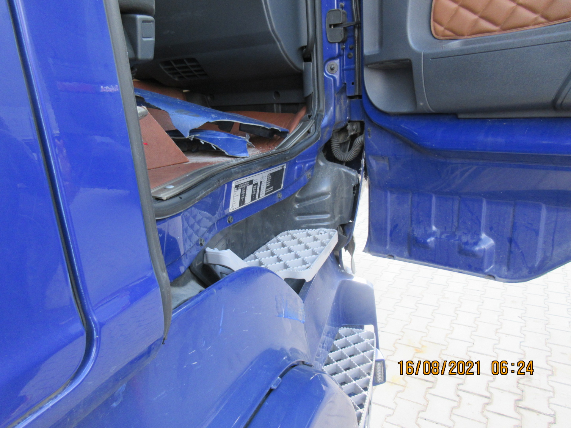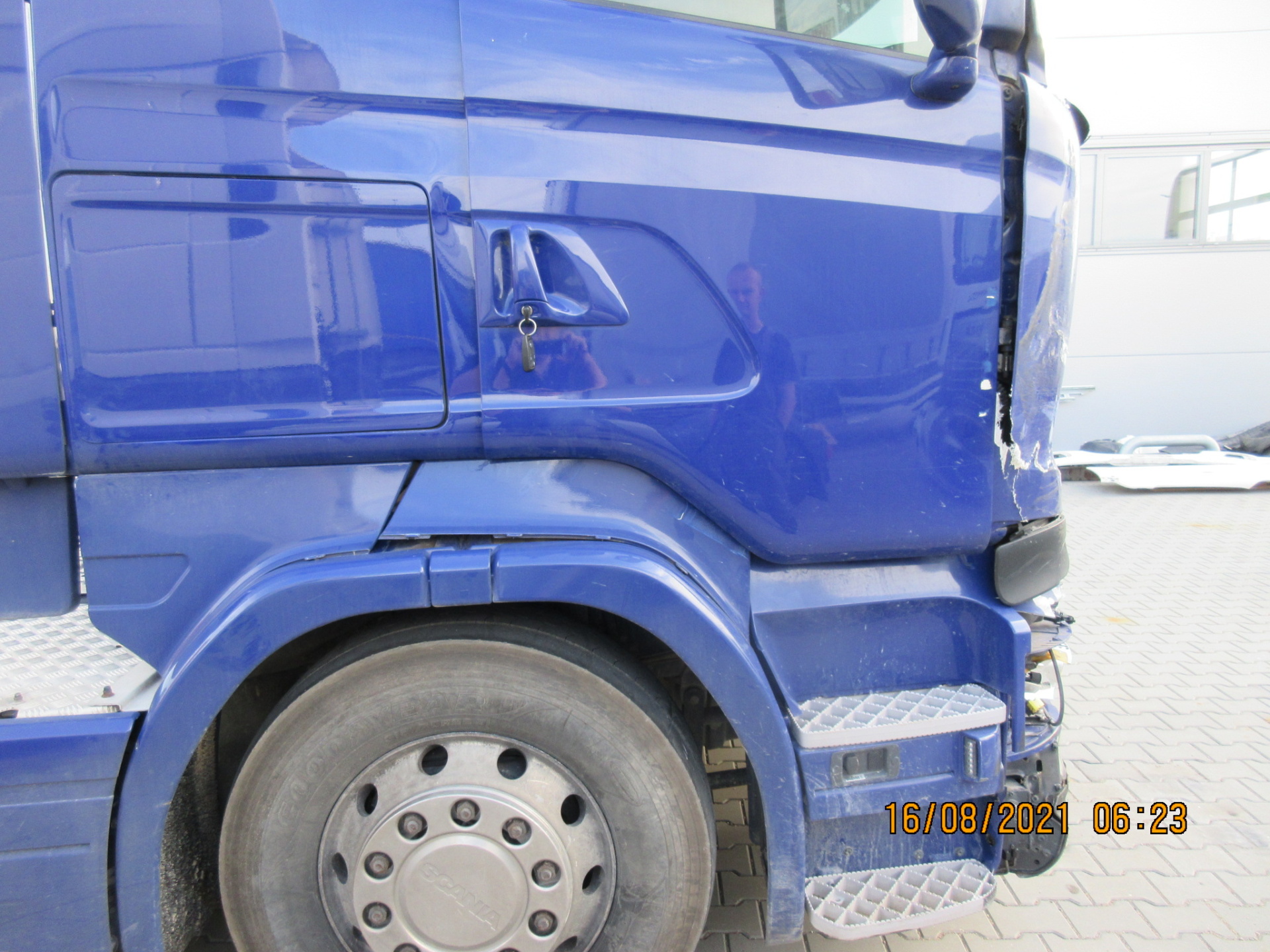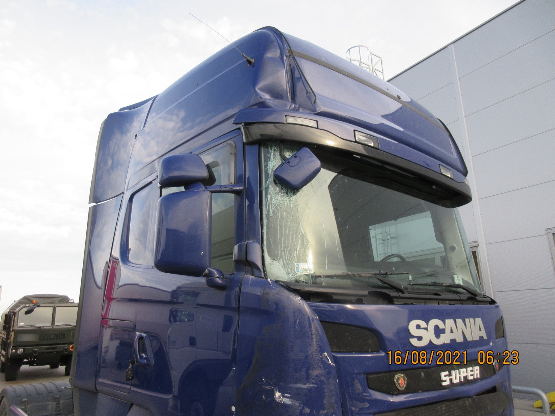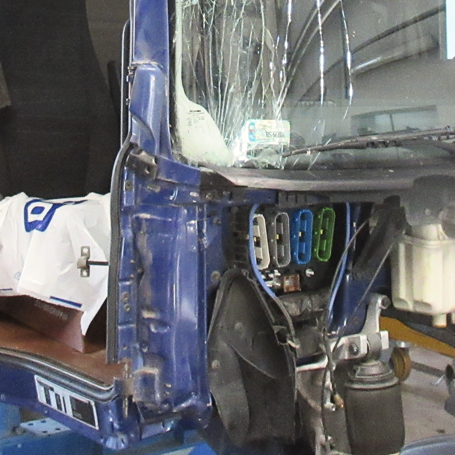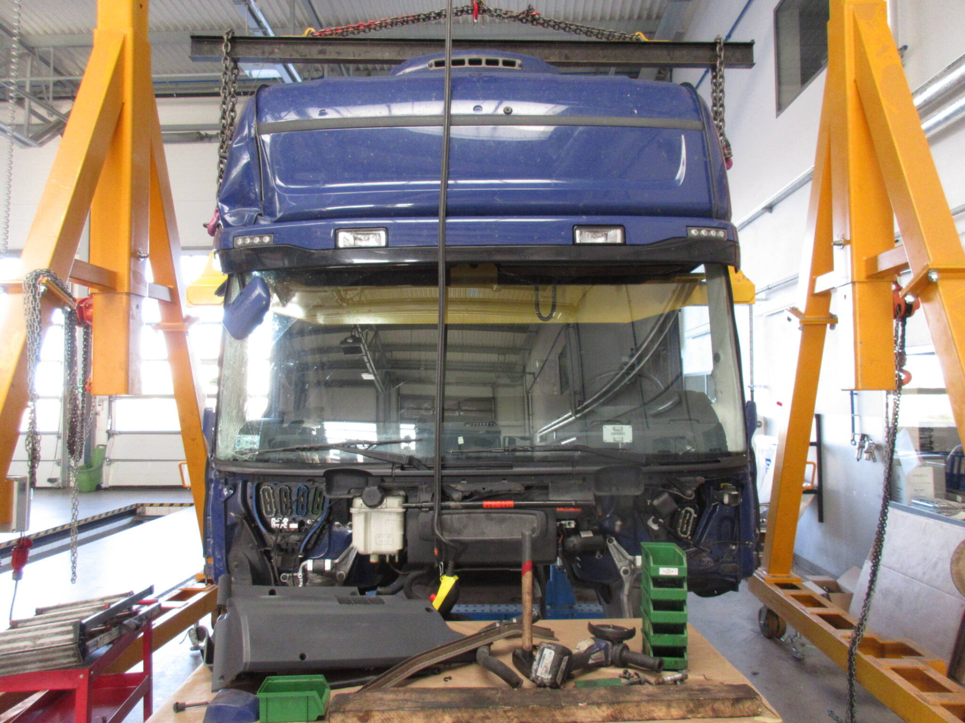 - wymianę wszystkich uszkodzonych elementów: szyba czołowa, maska silnika, reflektor prawy, drzwi prawe, zderzak, prawy stopień oraz elementy poszycia prawej ściany kabiny,