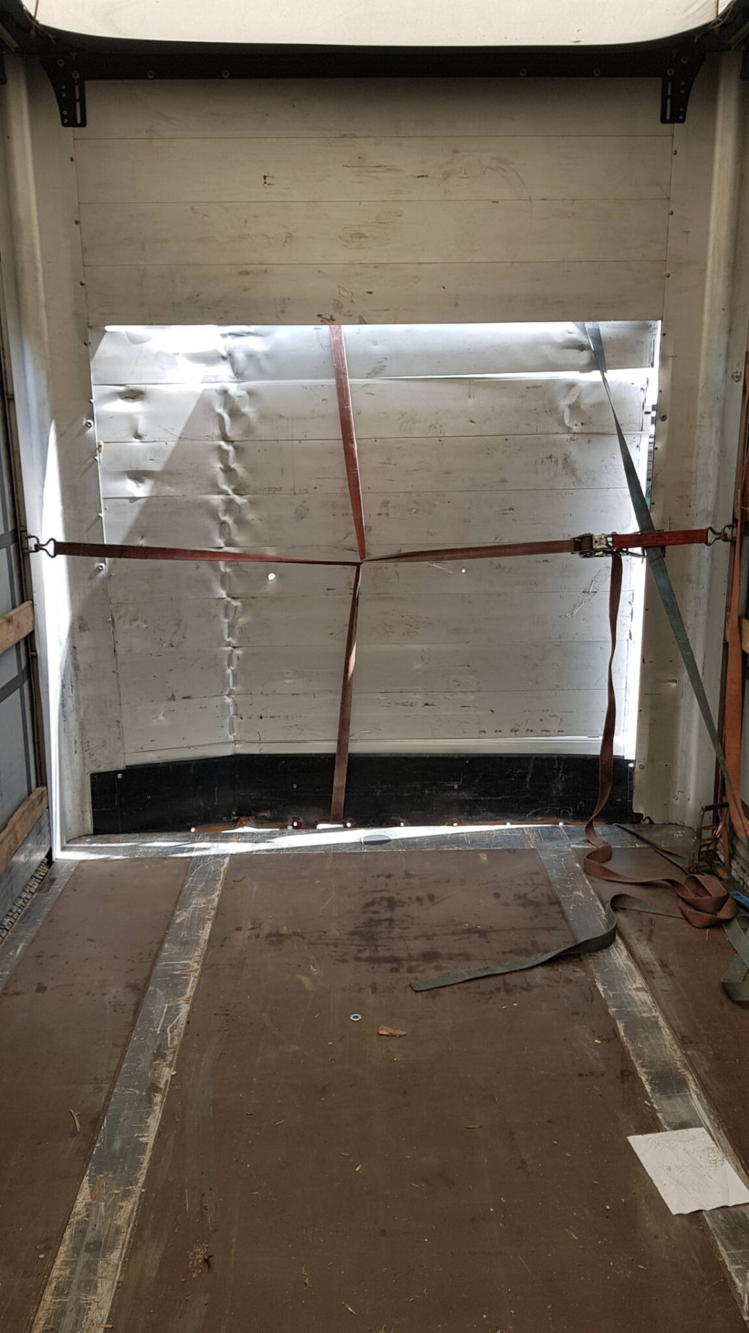 - Demontaż uszkodzonych elementów i wymiana przedniej ściany naczepy.