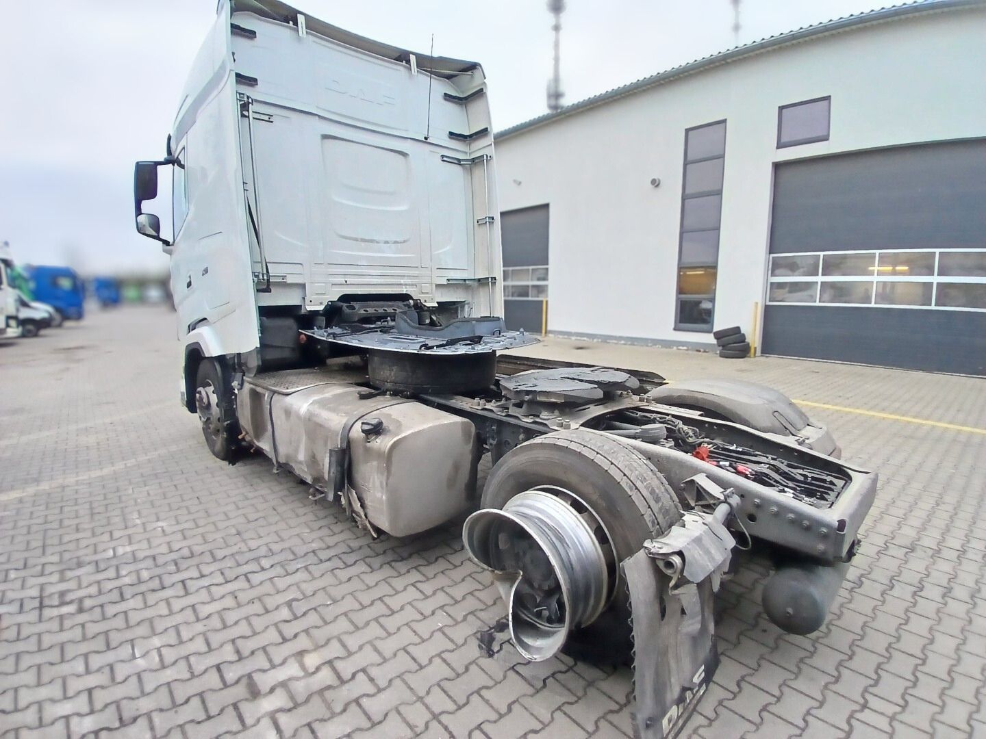 Do serwisu Grupy DBK w Olsztynie trafił ciągnik siodłowy marki DAF XG, który uległ poważnym uszkodzeniom w wyniku kolizji drogowej. Zdarzenie miało miejsce, gdy sprawca na łuku drogi stracił panowanie nad swoim pojazdem i uderzył w DAF-a. Skutkiem kolizji były rozległe uszkodzenia mechaniczne oraz blacharsko-lakiernicze, wymagające kompleksowej interwencji serwisowej.