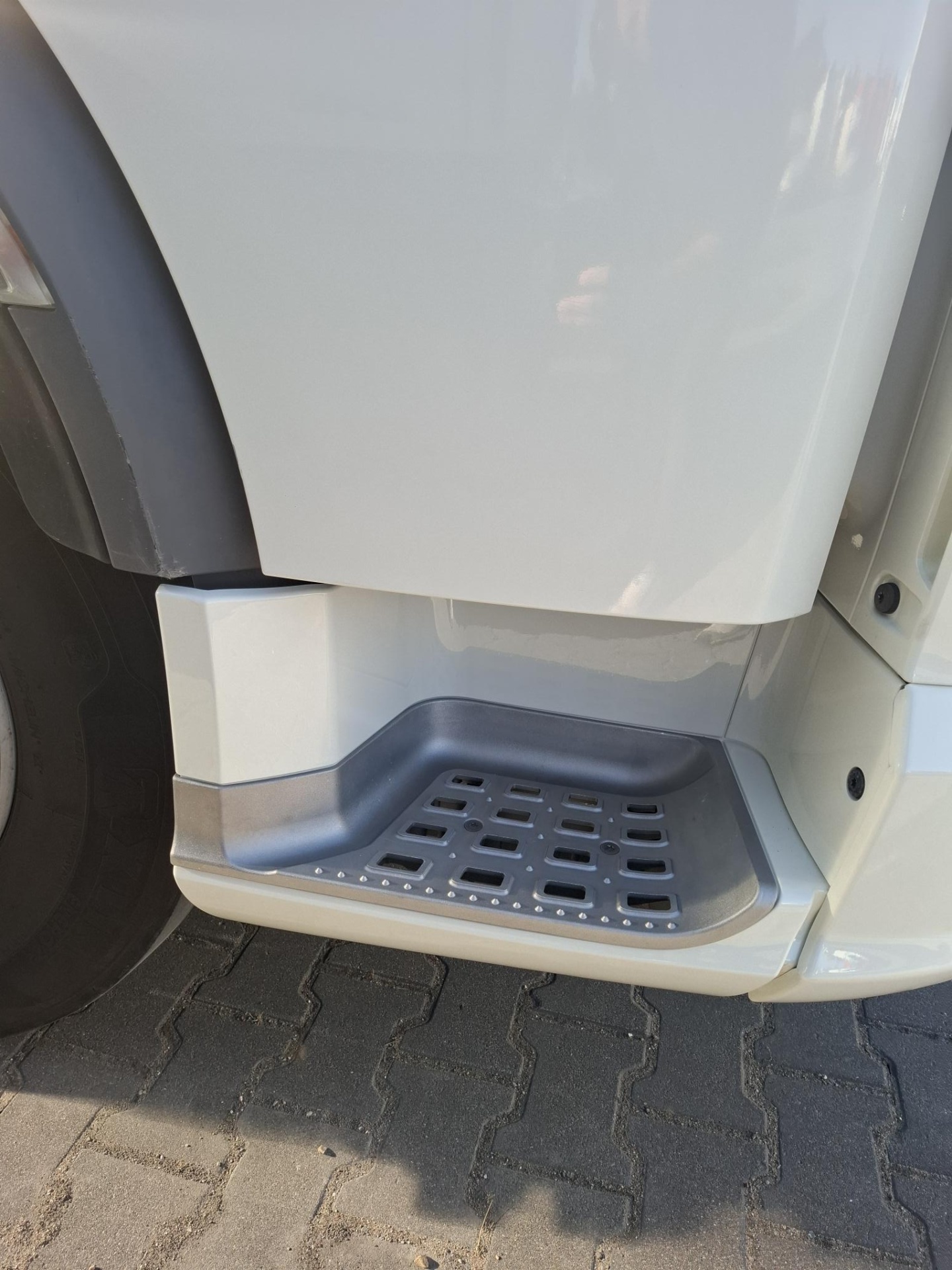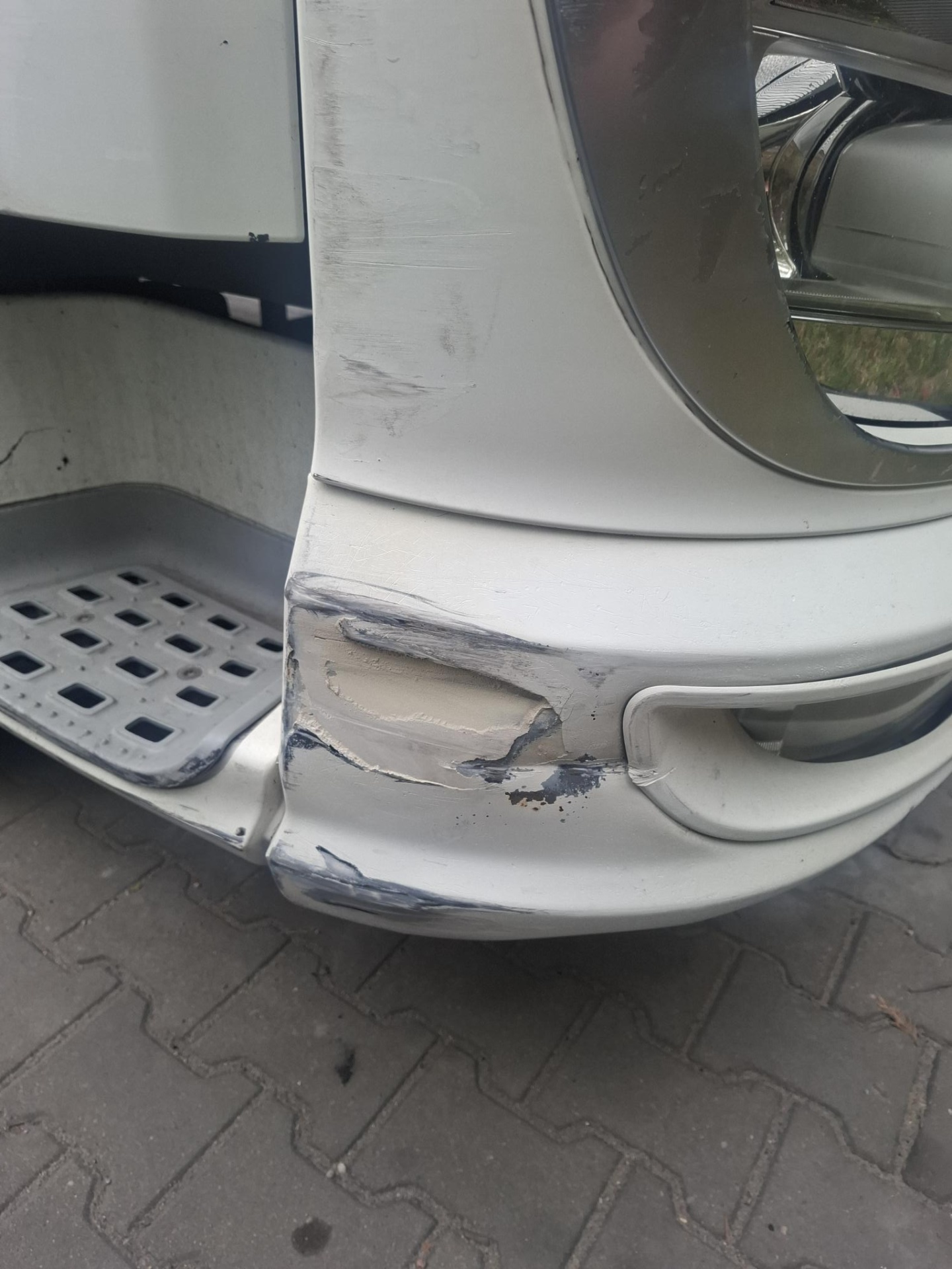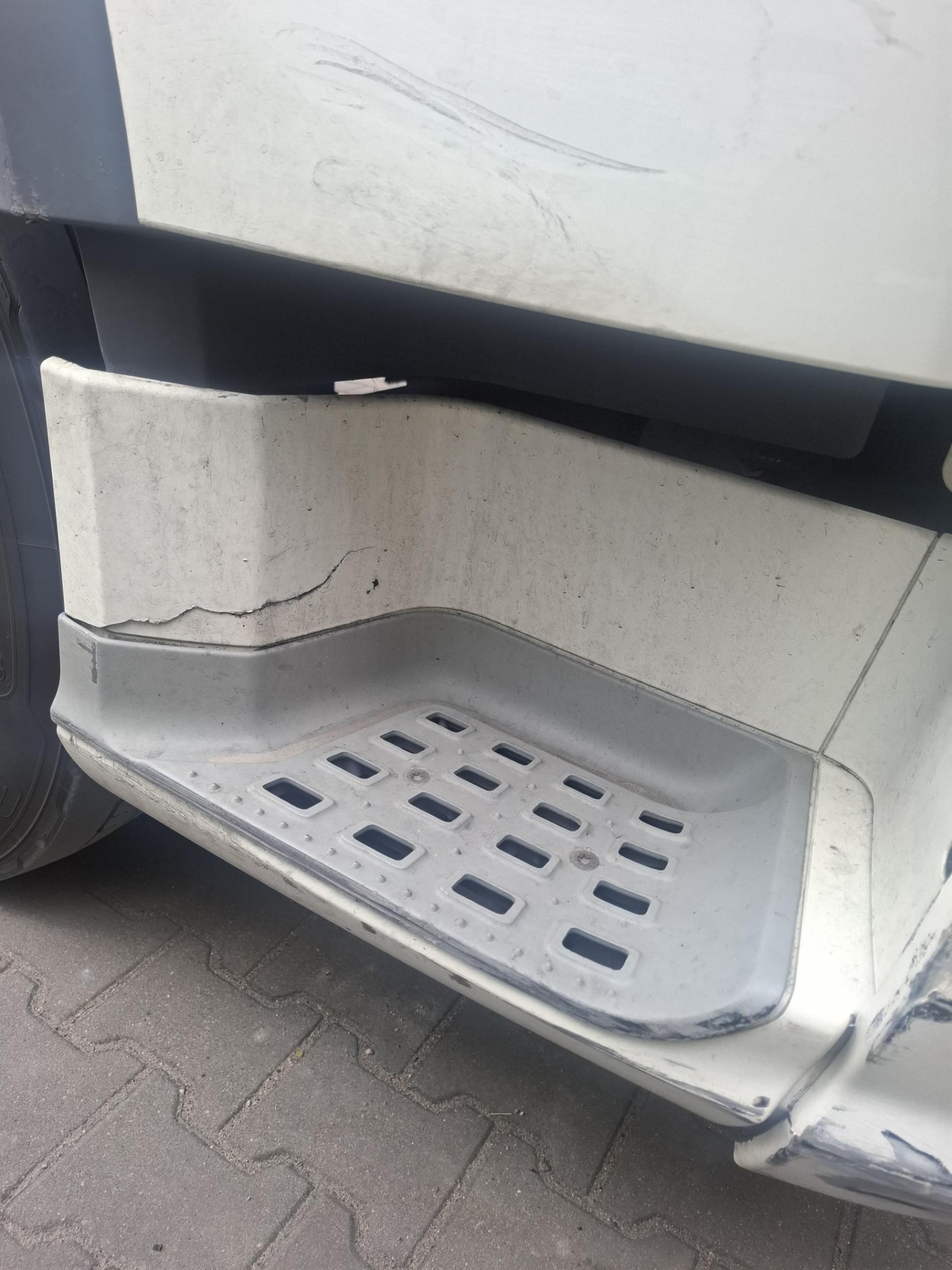 - Demontaż uszkodzonych części: zderzaka, prawego spojlera kabiny, okulara reflektora oraz kompletnych stopni wejściowych.