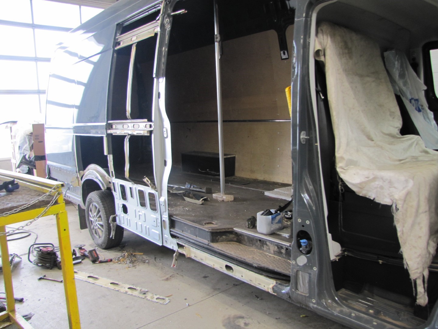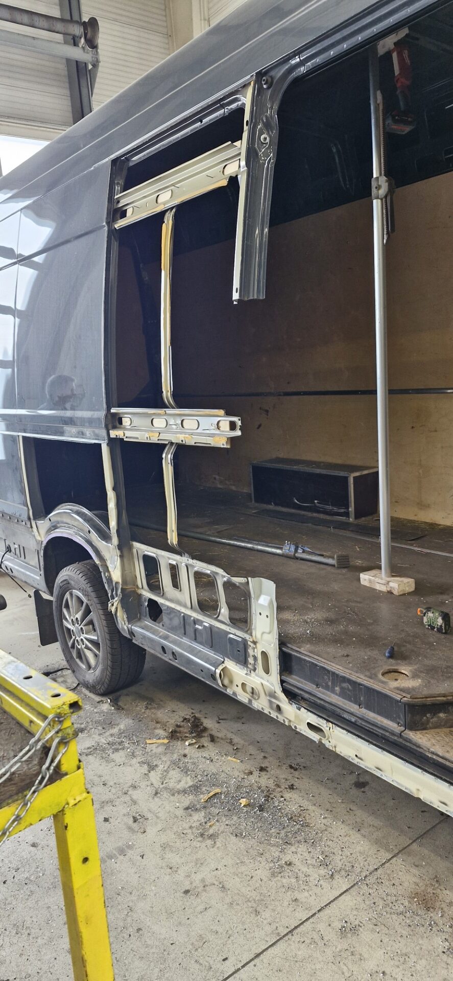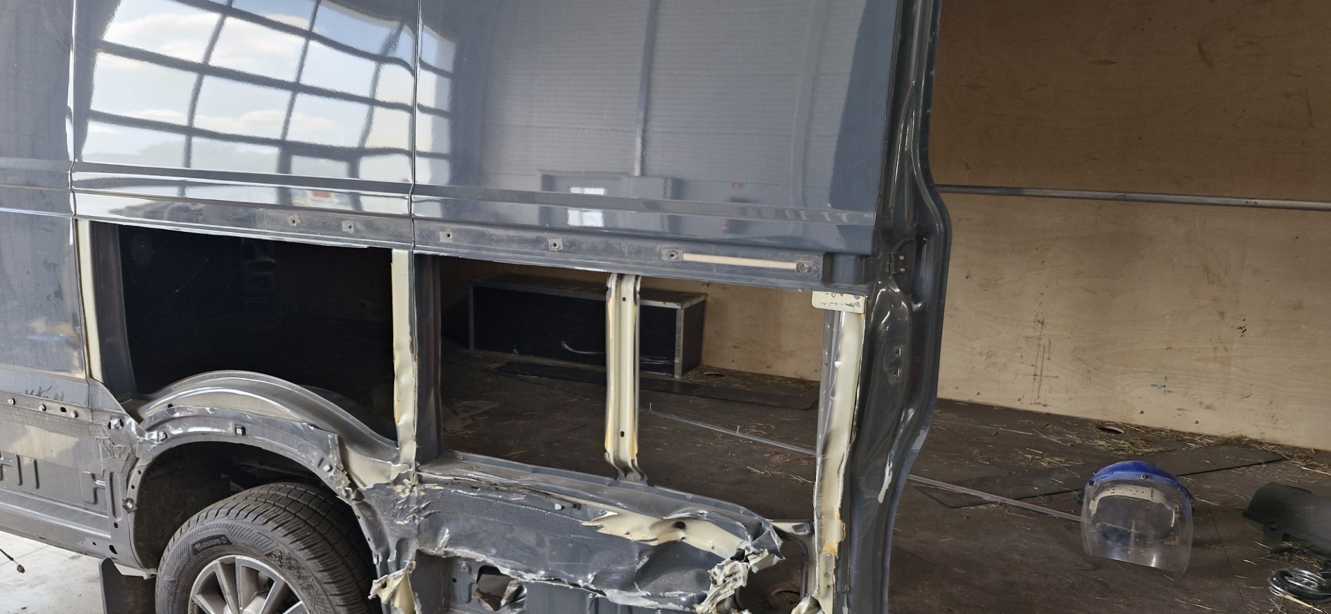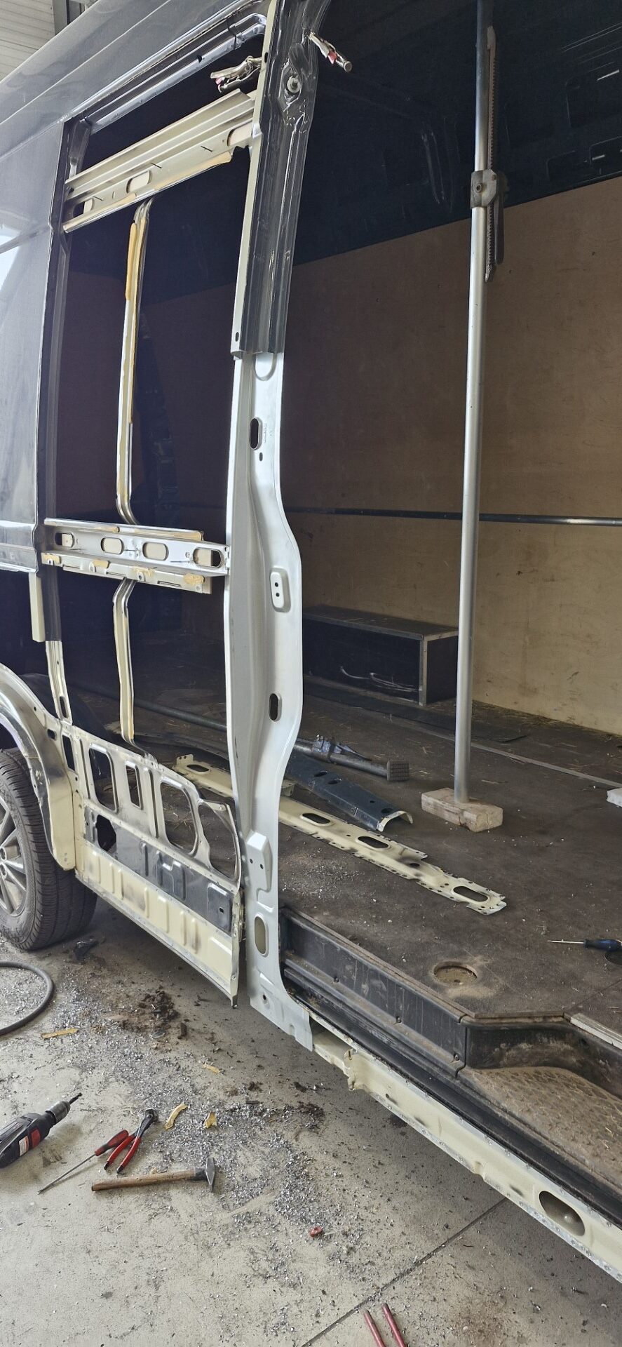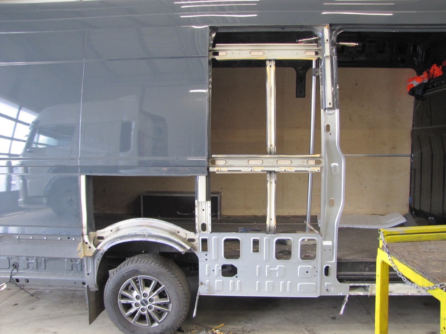 - Wymianę uszkodzonego prawego błotnika, drzwi przesuwnych oraz wzmocnień wewnętrznych, zgodnie z technologią producenta.