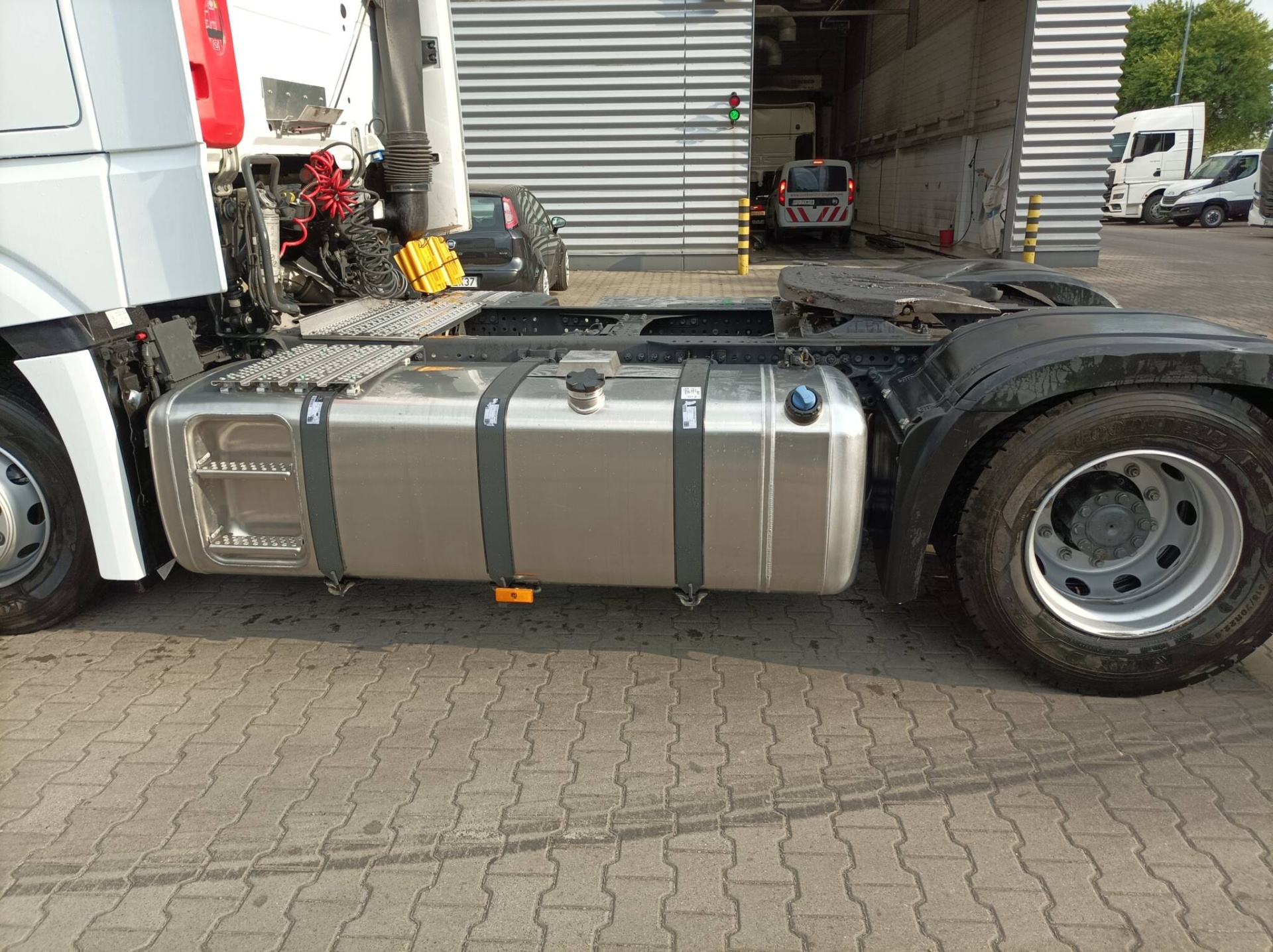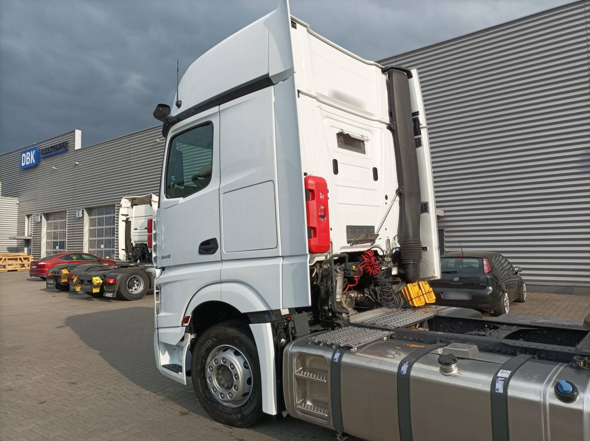 Pojazd ciężarowy Mercedes Actros trafił do serwisu Grupy DBK w Niepruszewie w celu kompleksowej naprawy po dużej szkodzie komunikacyjnej. Zakres uszkodzeń wskazywał na konieczność szeroko zakrojonych działań, obejmujących zarówno elementy karoserii, jak i kluczowe konstrukcje podwozia oraz układy mechaniczne. Realizacja wszystkich prac odbyła się w ramach naprawy gotówkowej.